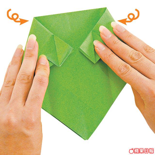 7.額頭及下巴多餘的部份往後摺,最後把眼睛3個尖尖摺平,KERORO便初步完成。