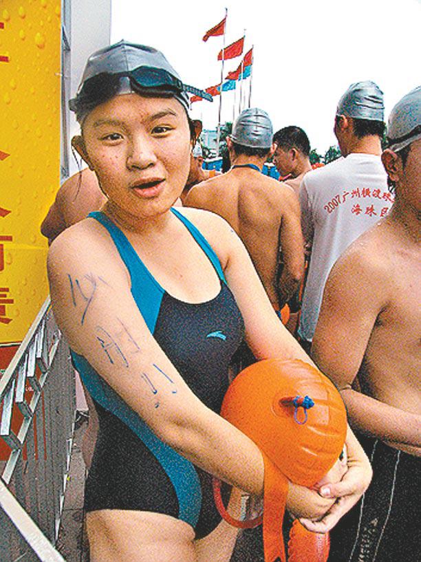 任文職的楊小姐(右):今年由公司組織第一次游珠江,感覺刺激,在廣州生活當然希望珠江水變得亁淨。雖然目前仍混濁,但希望活動能喚起大家的環保意識。以前游過珠江上游支流江水,希望珠江水終有日恢復到好似上游咁清咁亁淨。