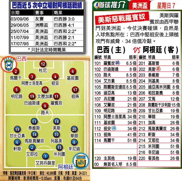 美洲國家盃周日展開夢幻決賽,由南美兩大雄師巴西與阿根廷交手;阿根廷雖然5戰全勝,有遇神殺神之勢,但巴西可謂阿根廷剋星,近5次中立場對阿根廷未輸過,今仗一於再追巴西不敗,捧讓球主客和「主勝」。(球賽編號:星期日7;有線61及64台明日5:05am直播)牽牛