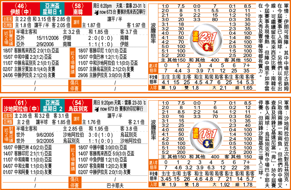 周日進行餘下兩場亞洲盃8強賽,強陣的伊朗於馬來西亞對表現欠佳兼將帥不和的南韓,勝望甚濃,「讓球」少讓平/半,必捧上盤(球賽編號:星期日1;now673台今日6:20pm直播);同日烏茲別克於印尼鬥沙地阿拉伯受讓平/半,則可吼下盤(球賽編號:星期日2;now673台今日9:20pm直播)。青蛙仔