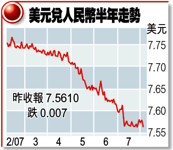 人民幣兌美元昨表現穩定,開盤中間價較對上交易日升85點子至7.5598,收報7.5610,較上周五升70點子。