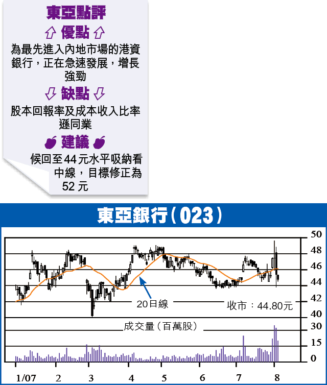 市場對東亞銀行(023)中期業績期望甚高,公佈前搶高至49.60元,而業績遜於預期,股價曾急跌至43.80元,兩日波幅達11.7%,反映市場的失望。
