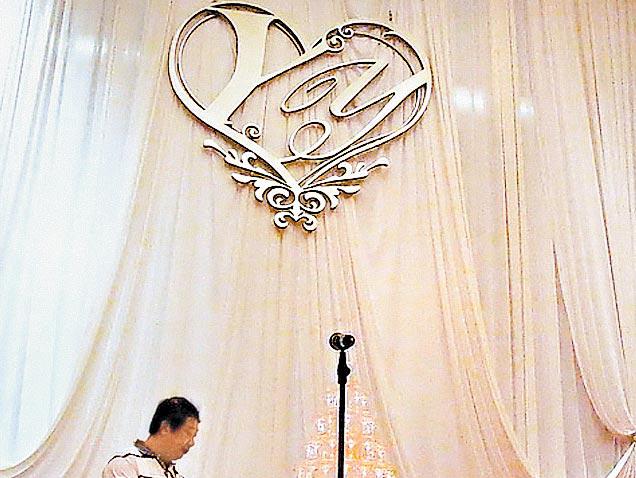 浦東香格里拉婚宴大堂開始進行佈置(圖左),當中最醒目的是姚、葉的英文縮寫YY(圖右)