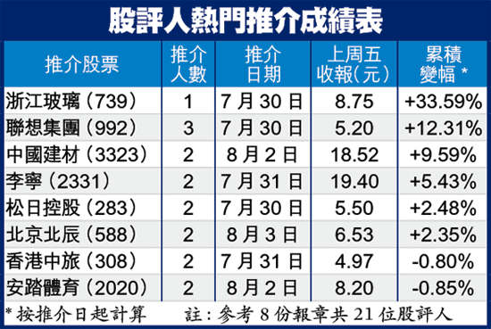 芸芸股評人推介的股票當中,以炒行業周期回升的浙江玻璃(739)升幅最為顯著。高盛指受惠玻璃業周期上升,浙玻產能將增長35%,加上新增上游業務的帶動下,料可轉虧為盈,給予買入評級,並大幅調高目標價,刺激浙玻自推介日起計,急漲33.6%。