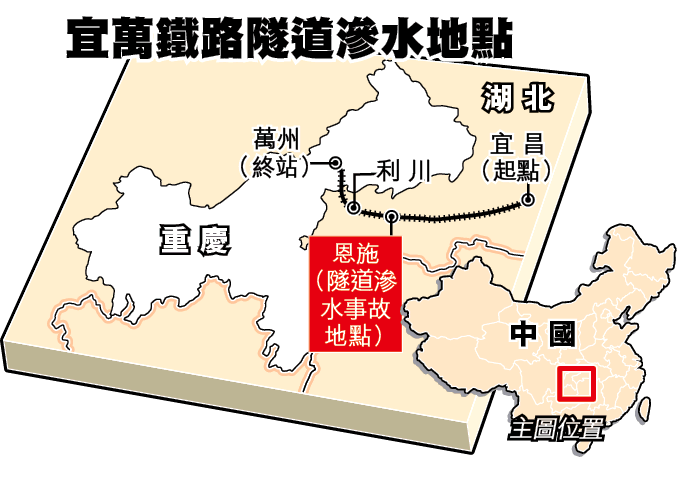 正在施工中的湖北宜昌至重慶萬州「宜萬鐵路」,昨日凌晨1時許發生嚴重事故。位於湖北恩施巴東縣野二關鎮的一段鐵路隧道,疑因進行爆破工程後出現滲水,導致52名工人被困。當局隨後陸續把工人救出,至昨晚仍有9人受困。