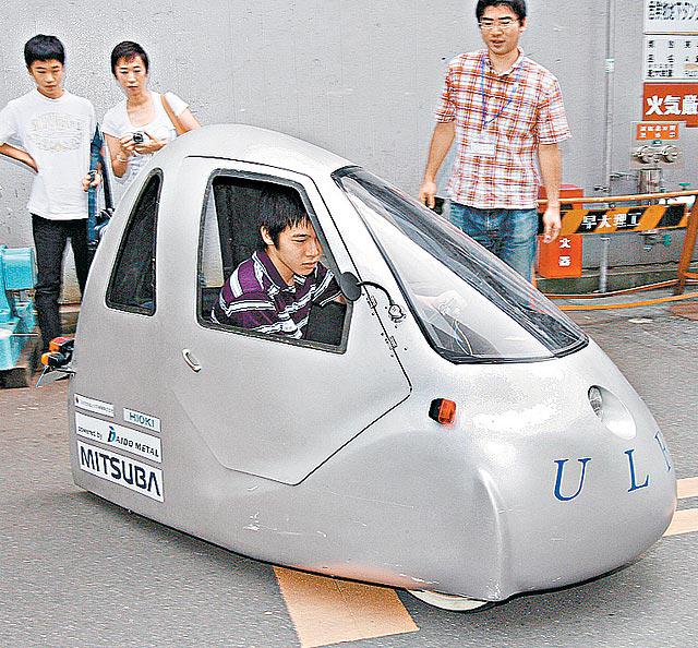 日本早稻田大學學生親自示範,駕駛他們所研製的超輕型燃料電池車,莫小覷這架只有2米長單座位汽車,它用燃料電池及電容器混合電池推動,時速最高達50公里。