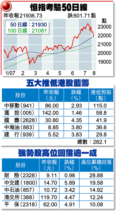 【本報訊】港股市值昨單日蒸發5320億元,減至16.36萬億港元。主板成交微增至782.3億元,最後15分鐘更以百億成交再挫75點,而整體跌勢有擴散迹象,逾八成、約千隻股份下挫,連強勢明星股財險(2328)、中交建(1800)及中石油(857)等仍未止血,39隻藍籌僅國泰(293)微升及煤氣(003)力保不失。