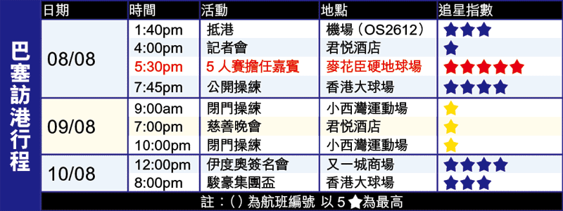 香港作為巴塞亞洲之旅最後一站,而且行程緊密。球隊乘專機抵港後,隨即在下榻的酒店舉行賽前記者會。5名球員(名單待定)約在黃昏5:30pm踩入旺角,並應贊助商邀請擔任5人足球賽的頒獎嘉賓。