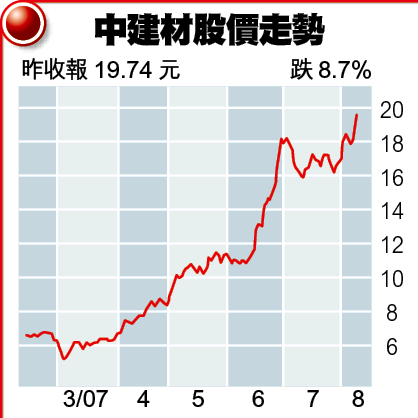 中國建材昨午2時43分停牌,收報19.74元,升8.7%,隨即透過大摩配售,配售股份當中,91%是新股,其餘是來自社保基金的舊股。