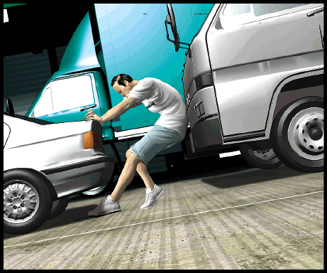 3〉司機用背部頂住貨車車頭,雙手撐住前面私家車,試圖阻止貨車繼續溜前,並大叫救命