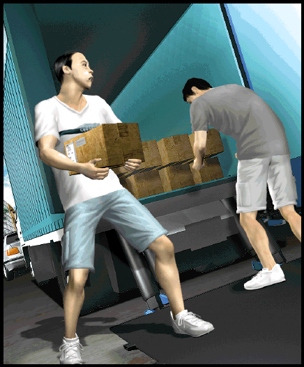 1〉一輛貨車停泊在斜路路邊,司機和跟車工人在車尾落貨