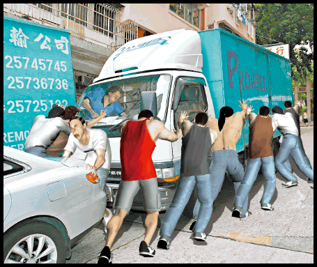 4〉附近車房和運輸公司十多名「大隻佬」聞聲趕至頂住貨車,司機已被兩車夾住,有人則登上貨車解困