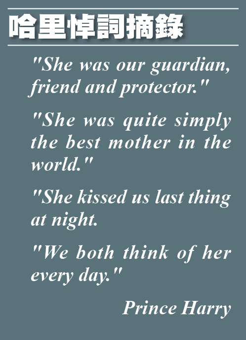 花了數月時間細心安排這場彌撒的威廉和哈里,穿着深藍色西裝,結着領帶。威廉在台上選讀了《聖經》中聖保祿寫給以弗所、談及尋求「內在力量」的書信。哈里則向着500人致追思悼詞,一字一語一句,都是他親自寫下,寫出對亡母的無限想念。