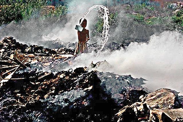 潑啊……潑……一名光着身子的小男孩,在滾滾濃煙,四周盡是廢墟和仍有暗火燃燒的環境下,手拿水勺,不停地向早已化為灰燼的瓦礫潑水,試圖搶救他曾經住過的家園。深圳拆遷人員日前闖進一個違法興建的居民小區,將百名外來民工和家屬推到一邊,一把火將逾萬平方呎的家園燒毀。在「胡溫」提倡和諧社會下,竟出現如此一幕,難怪有網民批評「在深圳繁華的背後,竟是骯髒醜陋、人性泯滅!!!!」