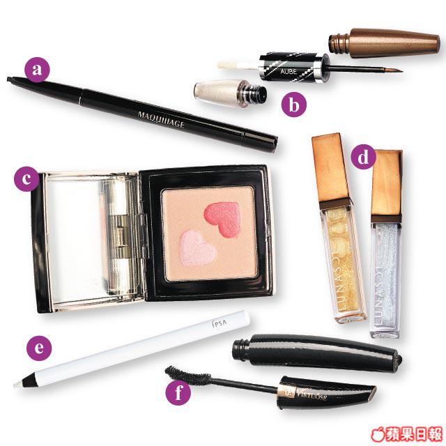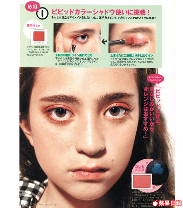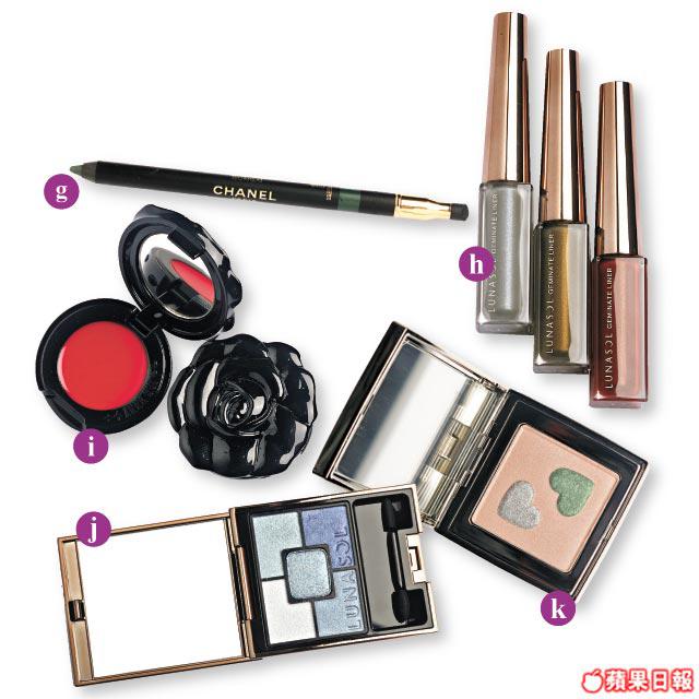 玩彩色眼線時,記得要作鮮明對比,如藍襯綠、粉紅撞紫等。上下眼線要用不同色,下眼頭還可加銀灰、珍珠白色,使眼妝更立體。