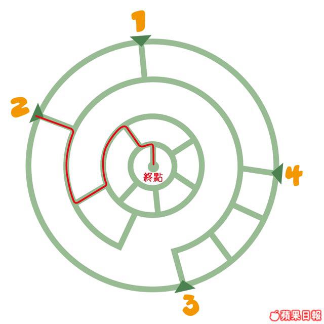 眾人遇上了有4個入口的賽道,但只有一個能通往圓心中間的終點,你能告訴他那個才是入口嗎?