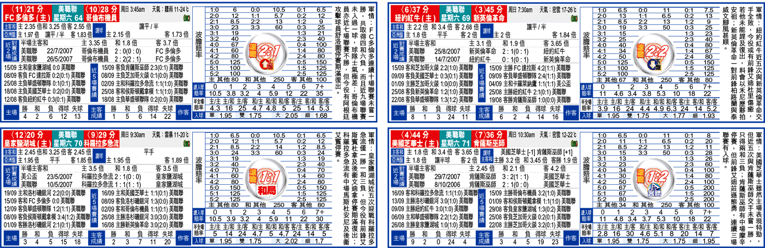 另外,紐約紅牛雖然近況一般,但周六鬥新英倫革命時有主場之利,加上前鋒安祖入球能力強,料今役開「大」機高。