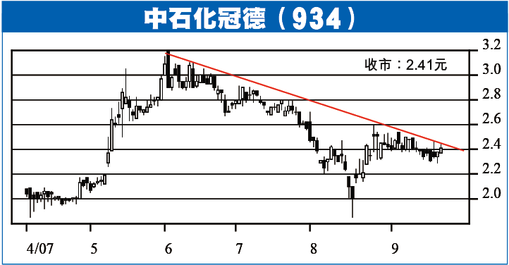大升浪惠及所有國企股,尚未炒上者遲早獲資金垂青。中石化(386)整系表現不俗,尚有一隻滄海遺珠中石化冠德(934)。該股今年中曾有追捧,一度炒上3.20元,之後調整至1.85元呈「雙底」反彈,止於2.60元後轉趨牛皮橫行;近日成交漸增,料有資金部署大炒落後,畢竟冠德亦有機會受惠系內重組,可以冷敲,跌穿2.20元止蝕。