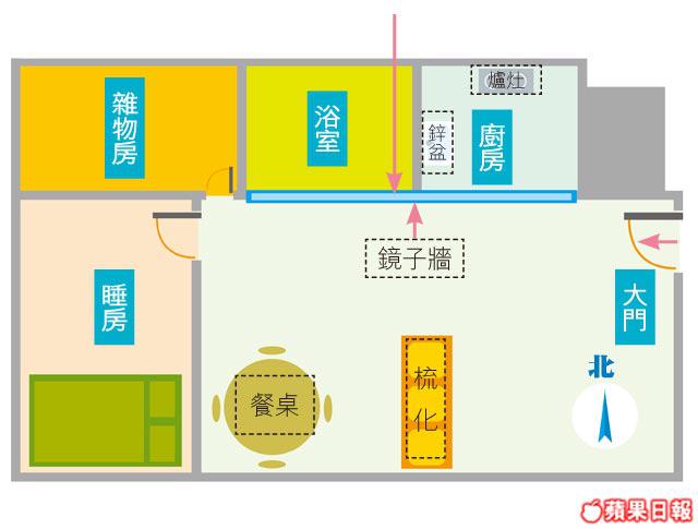 讀者鄭先生家住柴灣,他說在這個單位居住兩年以來,自覺處於逆境,而且最近有一晚感覺似被甚麼東西壓着,不能動彈。梁善行師傅表示,縱觀其單位,風水格局其實不錯,最大問題是從該單位的廳和房外望就是柴灣墳場,更不堪的是錯誤的室內設計──廳內有一大幅鏡子牆對向墳場,將凶星和陰邪帶入屋。