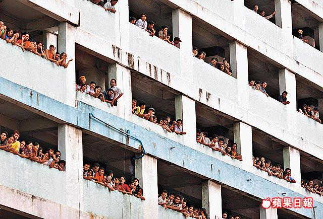 沒勇氣上街遊行的仰光居民,在住宅的露台,向下面遊行的示威者打氣。路透社