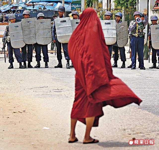 僧侶昨午試圖進入仰光瑞達剛大金塔,遭一字排開的防暴警察阻撓。路透社