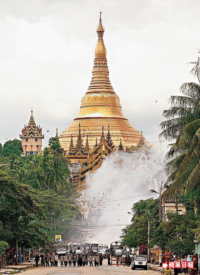 防暴警察在瑞達剛大金塔外施放催淚彈驅散示威者,令現場白煙瀰漫。路透社