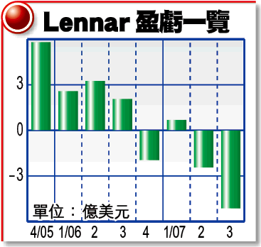 受累美國樓市疲弱,樓價不斷下滑,以收入計美國最大建築商Lennar縱使已裁減35%員工,仍無法拯救業績,上季轉盈為虧,蝕逾5億美元,為53年來最惡劣的一季。