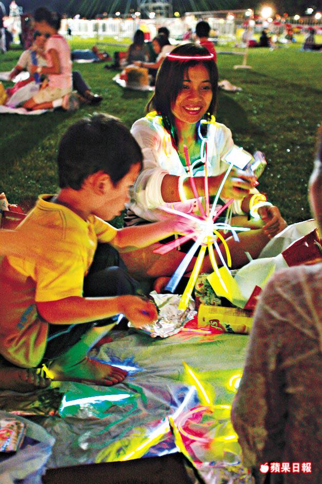 晚飯過後,不少市民更扶老攜幼帶同月餅及燈籠,在維園草地上,在月餅罐內燃點蠟燭,邊吃月餅邊賞月,小朋友則手持燈籠和螢光棒你追我逐,令維園草地充滿一片歡樂溫馨的氣氛。不過,維園內仍出現個別小童不顧勸喻煲蠟。
