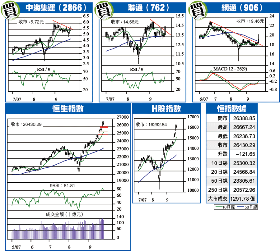 大市屢創高位,恒指突破26100之後,下一個目標仍看小時圖的旗形走勢升幅26960,假前高位距此已是不遠,再往上看,有28000至30000阻力區。