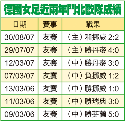 有一點值得留意的,是德國雖然近兩次與挪威交手均未能勝出,但其實她們近兩年鬥北歐球隊共取得5勝1和1負(見附表),因此,今役仍有優勢。
