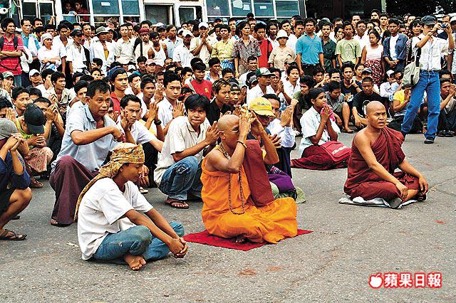 有眼淚,但仍只有眼淚。有示威者也毫不掩飾對軍警的不屑。有群眾見到一輛輛卡車載着軍警駛過,紛紛大拍手掌,輕蔑地高叫「大英雄呀!」有人向軍警大喊:「我們都是佛教徒!殺了僧人,你會下地獄的!」