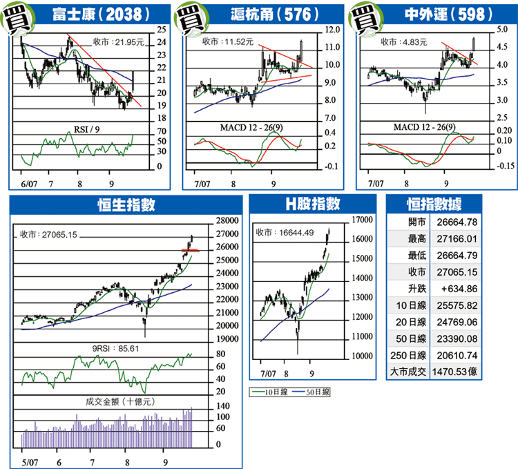 港股再創新高,恒指高開後持續向好,最高見27166,尾市升幅略為收窄,報27065,急升634點,成交亦增至新高1470億元,交投暢旺。現貨月期指以26976結算,10月期指收報27234,升760點,高水169。
