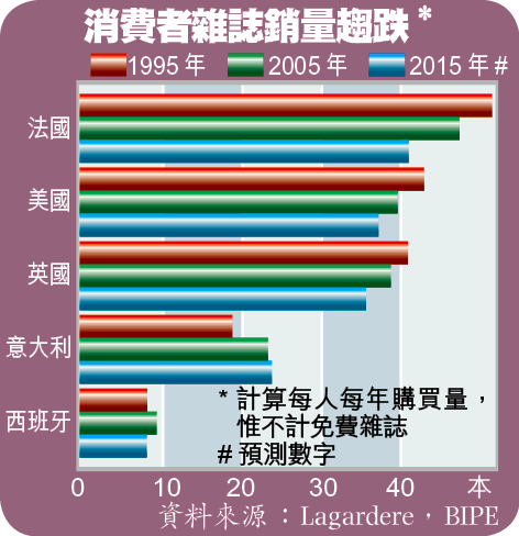 歐美雜誌出版商擔心,隨着人們花更多時間上網,雜誌銷量趨跌,並拖累其母公司業績。美國時代華納據報將出售旗下的全球最大雜誌社Time,但後者為此闢謠;惟業界揣測,時代華納快將出售旗下英國雜誌附屬公司IPCMedia。德國出版商估計,當德國媒體公司Bertelsmann新任行政總裁明年1月上任後,該公司會將雜誌部門Gruner+Jahr賣走。