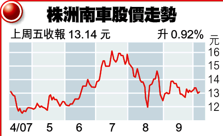株洲南車上周五在大市急升的情況下表現失色,僅微升不足1%,收報13.14元,其近期走勢亦較為落後,不過,綜合券商分析,其目標價為16.35元,較現價有24%潛在升幅。