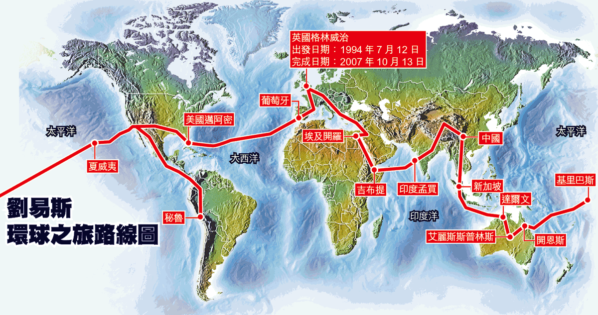 80天環遊世界,太普通了,13年才是壯舉。英國一名男子為了宣揚環保,1994年展開「人工動力」環球之旅,靠踏單車、划船、游泳等方式走遍全球,完全不借助汽油或電力驅動的交通工具。這趟旅途驚險百出,他兩度染上瘧疾、在中國被秘密警察追捕、在澳洲差點被鱷魚咬死。幸好他終於完成旅程,昨日(周六)返抵英國格林威治(Greenwich),創下首個人工動力環遊全球的世界紀錄。