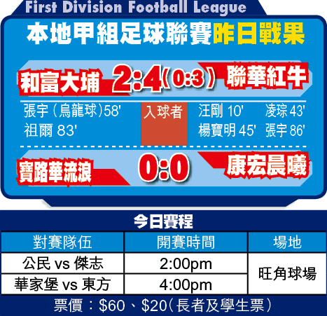 至於上周日迎戰東方後發生閉門毆鬥的聯華,則以4:2擊敗大埔,打開今季勝利之門,教練朴俊傑終於鬆一口氣。不過,他被追問內訌主角之一的後備門將劉磊為何沒有來港時只表示:「他仍是聯華球員,今次因為受傷沒有隨隊。」朴之後匆匆返回更衣室,不再接受傳媒訪問。