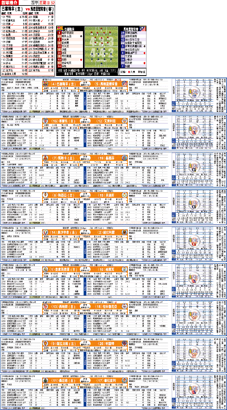 巴塞隆拿新球王美斯近況大勇,這位阿根廷國腳連續5仗入波,球隊連同盃賽已5連勝,加上朗拿甸奴已復出,應可忘記伊度奧缺陣的傷痛。但巴塞後防卻有漏洞,墨西哥中堅馬基斯因傷缺陣,佩奧爾上仗對雲達不來梅勉強復出,並先開紀錄,但及後再度受傷被迫提早退下火線,可見後防兵源告急。