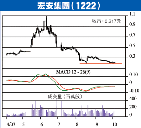 宏安集團(1222)見底回升,由近日低位19.8仙升上21.7仙,升幅9.6%,相對由年中開始的跌勢(由1.10元回落,跌幅超越8成),只係小兒科,股價再展升浪,有機會升番1個開。