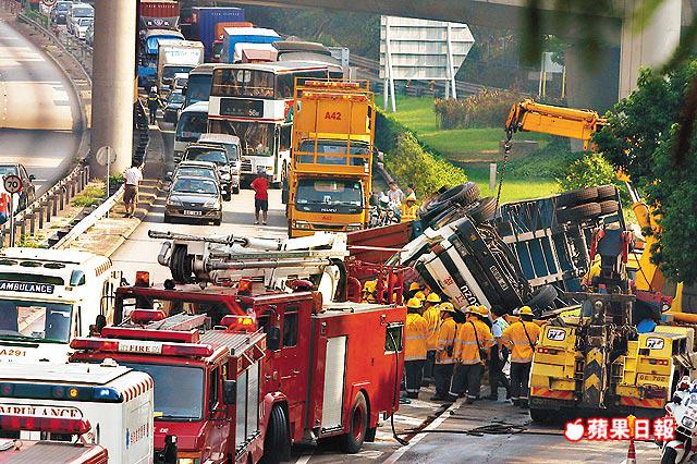 據警方初步調查,肇事時貨櫃車的車速不太快,但實際車速仍有待驗車確定。當時駕電單車經過的救護員表示:「見到架貨櫃車慢慢向右翻側……」意外中,貨櫃車的尾箱壓向路邊防撞鐵欄,而駕駛艙則剛巧壓向防撞欄末端的石壆上,司機位完全陷入石壆中,損毀嚴重。「佢初時仲有反應,仲郁得㗎!」休班救護員走近試圖拯救被困司機,但由於車頭損毀得太嚴重,他根本無法打開車門救人,惟有致電報警。