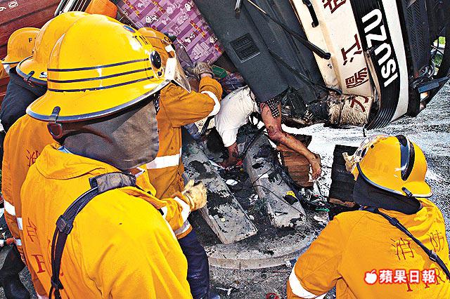 【本報訊】一名年僅23歲的貨櫃車「新牌仔」司機,昨日駕駛40呎貨櫃車運送一批布疋返回內地途中,在屯門皇珠路失事翻車,駕駛艙撞向路邊石壆,車頭嚴重損毀,司機頭部重創;一名休班救護員經過現場嘗試營救,他說:「佢初時仲有反應,仲郁得㗎!」可是,由於司機被困在有如廢鐵的駕駛艙內,拯救困難,消防員事後要花50分鐘才將他救出,其間奉召到場的醫療隊證實他已當場死亡,警方正調查意外原因。 記者:江寶龍、陳天華、周鴻熙