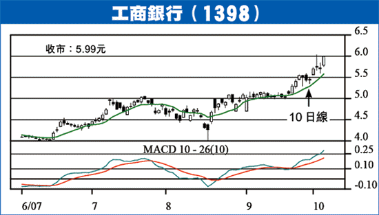 工商銀行(1398)上日報收5.99元,升4.7%,這隻佔恒指比重4.06%的實力股,自去年10月27日上市至今,累積升幅只約1倍,甚為落後,周線圖呈重大突破,是好友用以推高指數的大好時機,相信股價很快會推向7元關,破位看8.8元至9.2元。現價買入,以5.4元作止蝕位,股價上破6.3元可加1注。