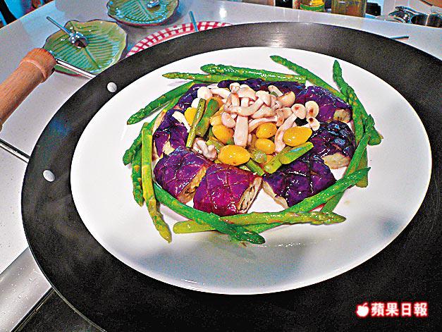 陳志雲親手為陳法拉煮齋菜「醬汁蟠龍蒸茄子」(圖)。