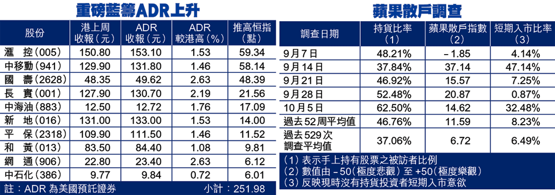 港股上周走勢驚濤駭浪,蘋果散戶調查顯示,有貨在手的散戶持貨量進一步增加,上周再升10.02個百分點,至62.5%,已是連續四周出現持貨量增加。而短期入市意欲亦大升31.61個百分點至32.48%,反映散戶認為後市可望再創新高。至於看好後市人數比例則下降6.25點,至上周的14.62點。