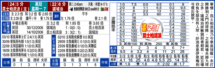 周一英冠獨腳戲,聯賽未開齋的昆士柏流浪,主場迎擊作客未開勝門的諾域治,平手盤主隊稍為秤先,惟今場心水乃2.02倍入球「大」。(球賽編號:星期一7;now898及無綫收費電視998台明日2:45am直播)