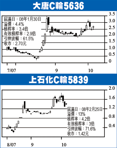 ■大唐C輪5636上周收2.70元,比周四升0.25元,成交4球。此輪08年1月30日到期,行使價7元,溢價4.4%,槓桿率3.4倍,有效2.9倍,引伸波幅61.5%,街貨25.4%。正股見11元,此輪價內值損耗低,理論價達4.234元,升57%。