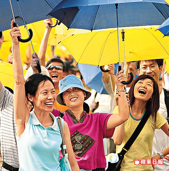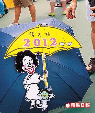 從事廣告設計的馮先生則畫了一幅漫畫,內容是笑容燦爛的陳太撐着黃雨傘,支持2012普選,她跟前則是當年死攬23條惡法的葉劉淑儀。