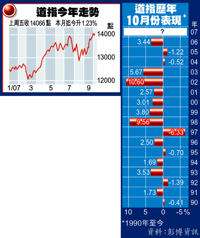 【本報綜合報道】道指上周五曾攀上14124.54的歷史新高,收報14066點,升91點或0.66%。踏入10月的首周,道指累積升了170點或1.23%。