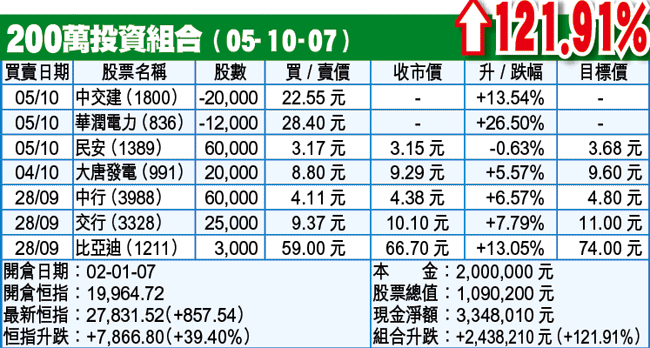 中交建(1800)和華潤電力(836)已達標沽出,民安(1389)已按計劃買入,倉內各股策略暫不變。
