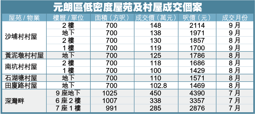 流浮山內較新的低密度住宅項目,有新世界發展的深灣畔,共建14座樓高3層住宅,提供120伙483至1025方呎單位,但實用率僅77%,今年初發售呎價2300至4000元,近期貨尾造價亦相若。