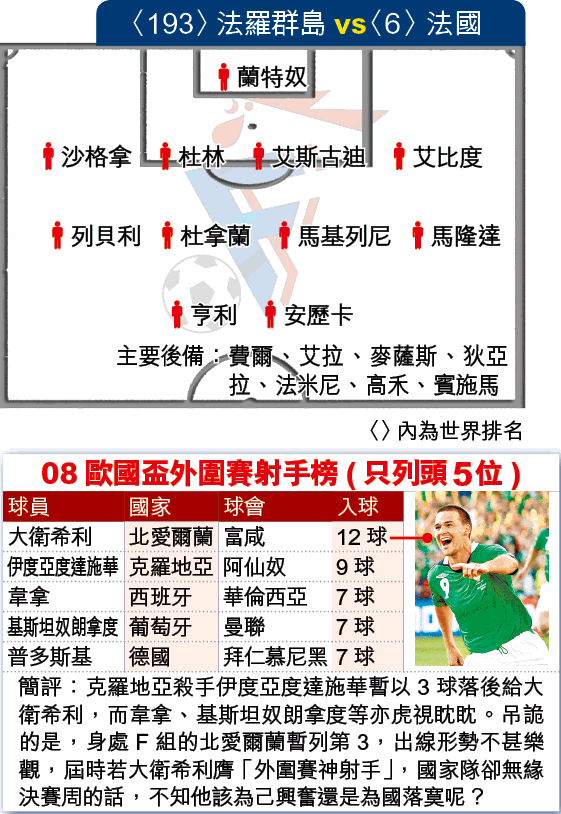 法國上仗不敵蘇格蘭,不單被破主場不敗身,連出線主動權亦讓予對手;教練杜明尼治直指欠缺亨利是關鍵:「亨利是可以左右比賽的球員,己隊比蘇格蘭創造更多進球機會,控球上也遙遙領先,但總是沒有將皮球送入網。」停賽復出的亨利將帶領列貝利、馬隆達等攻擊好手,作客世界排名只得193位的法羅群島,相信至少要重演首循環大勝5:0的戰果,才可安撫法國球迷。